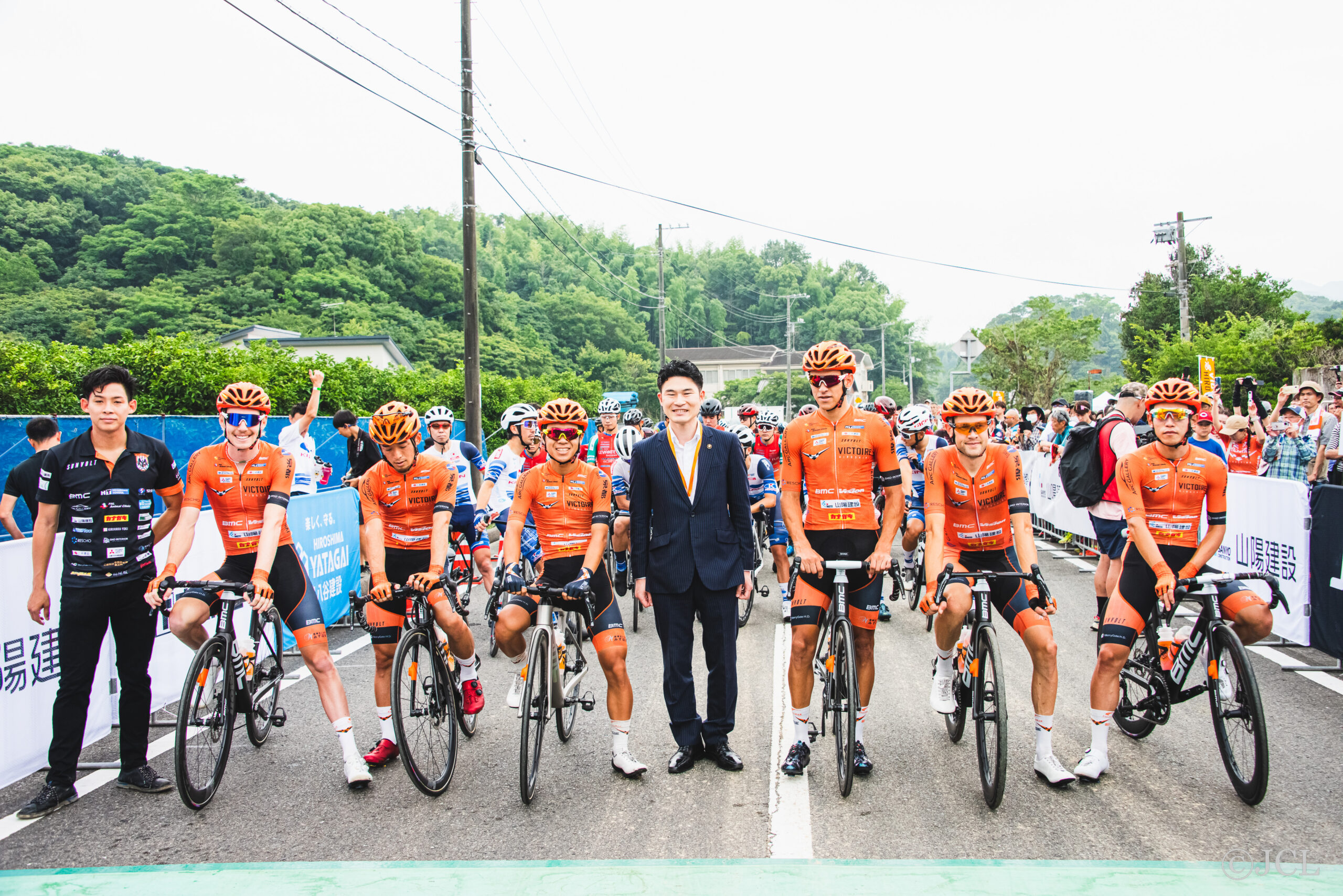 10.5kmを10LAPする105kmで行われました。ホストチームのヴィクトワール広島が最前列に並ぶとオレンジのチームグッズを手に観客が盛り上がります。いよいよレースが始まりました。
