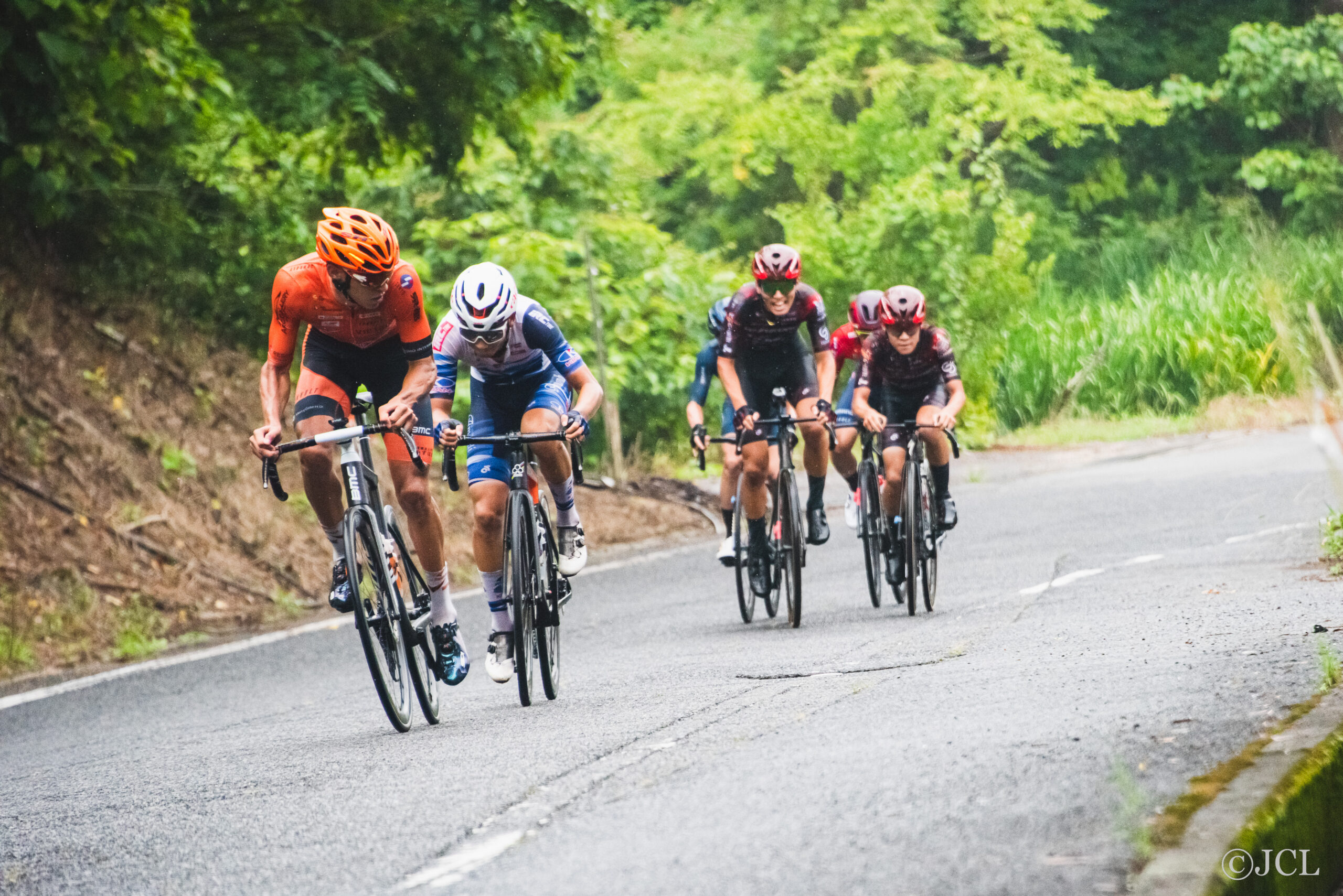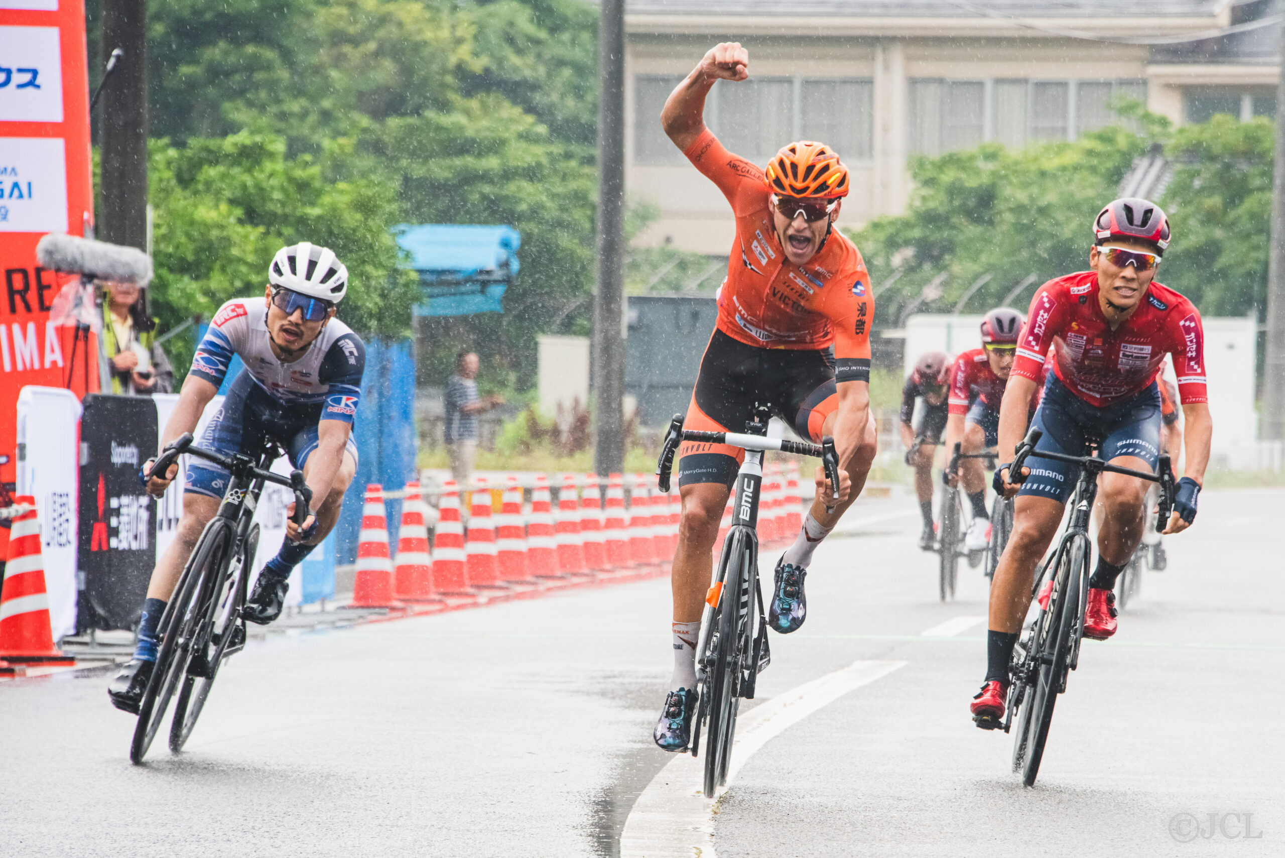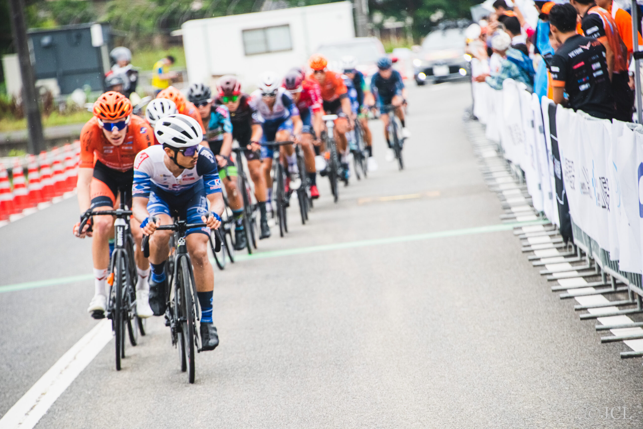 レースはゴールまで1時間を切るとリードメンバーの中で人数を多く送り込んだチームが盛んに抜け出しを図ります。VC福岡鎌田選手、ヴィクトワール広島のカーター選手とダイボール選手、キナン山本選手の姿が目立ちます。しかし、天候が雨に変わるとアクシデントが発生します。